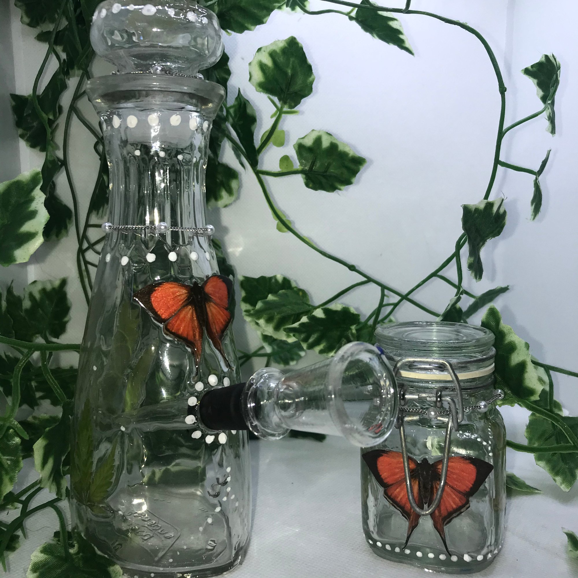 This vintage decanter bong and jar has been adorned with moths from Moth & Myth, real pressed cannabis leaves, and hand painted white accents, as well as pearl chain.